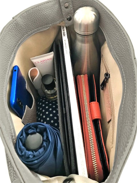 - Fully lined with an internal side zip pocket and leather mobile holder
